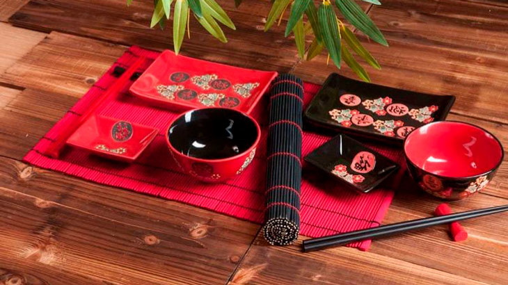 Еще один важный момент: нужно подобрать посуду в духе восточных традиций. Не очень по-японски будет подавать это блюдо в обыкновенных тарелках и есть вилками или еще хуже – руками. Можно приобрести японский набор посуды с красивыми деревянными палочками и с емкостью для приправы васаби и соуса.