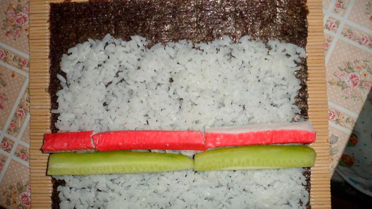 Смазываем слой риса сливочным крем-сыром, в середину укладываем ровненько порезанные маринованные огурчики и крабовые палочки или крабовое мясо.