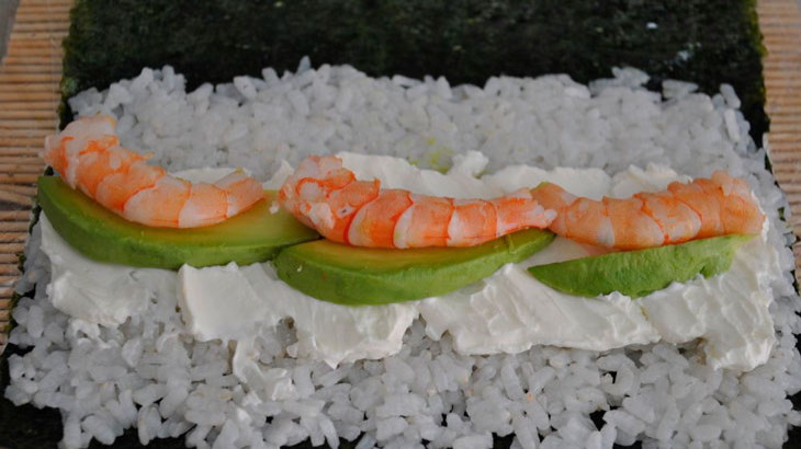 В середину листа кладем креветки, потом порезанные на полоски авокадо и огурец – теперь скручиваем ковриком-циновкой рулет поплотнее.