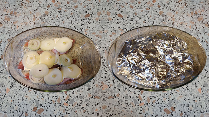 Закрываем филе алюминиевой фольгой и помещаем противень в духовку. Готовить нужно при температуре 230 градусов.