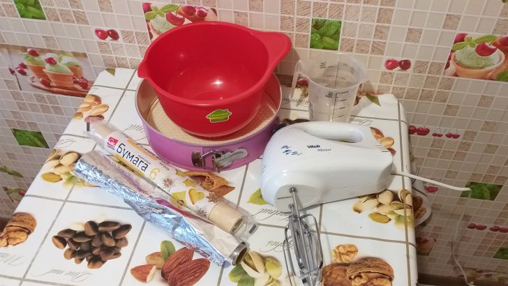 Чтобы потом не отвлекаться и не искать по всей кухне необходимые вещи, я заранее подготовила всю необходимую посуду. Для приготовления десерта нам необходимо: