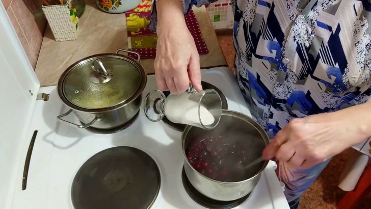 Ставим вишню на огонь и доводим до кипения, после варим ее не больше двух минут.