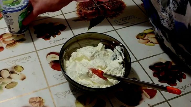 Добавляем в сметану 100 г сахарной пудры пол пакетика ванильного сахара. Все это взбиваем миксером минуты две, чтобы сметана хорошо соединилась с пудрой.