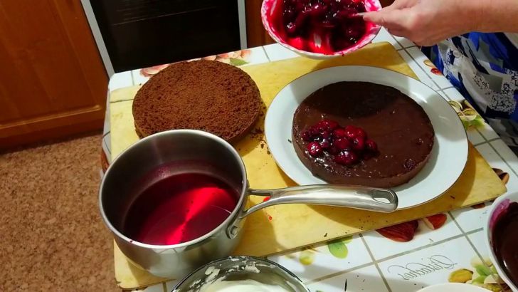 Далее на всю эту конструкцию кладем следующий корж и повторяем все действия. Третий корж, уже пропитанный вишневым сиропом, смазываем остатком шоколадной пасты и пастой вниз кладем его на крем предыдущего коржа.