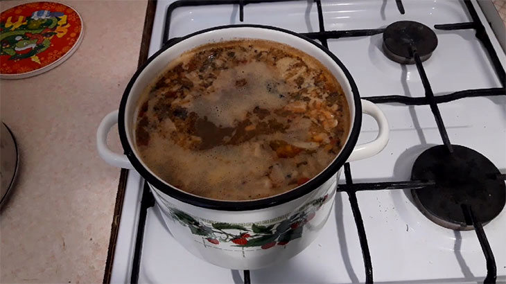 Засекаем ровно 10 минут. Именно этот промежуток времени необходим для проварки картофеля и риса. В течение этих 10 минут шумовкой периодически перемешиваем содержимое кастрюли и снимаем образовавшуюся пену. Газ уменьшаем до среднего значения, чтобы меньше выкипало воды.